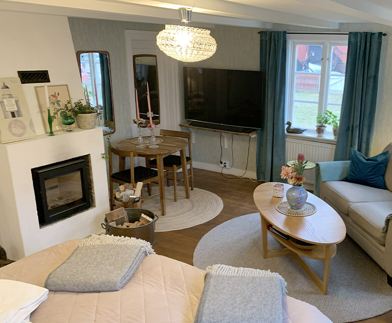 I vårt fina familjerum bor du lugnt och avskilt med två rum och eget badrum samt tillgång till ytterligare ett badrum som delas med andra gäster. Här har du en härlig dubbelsäng 160 centimeter samt i anslutande rum ytterligare en säng 120 centimeter. Egen matplats samt soffa. TV (55 tum) i rummet. Här får du en glimt av havet men är bara några fotsteg ifrån direkt havsutsikt i vår trädgård.